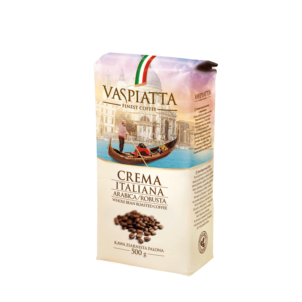 Vaspiatta Crema Italiana to starannie zbalansowana kawa ziarnista stworzona z myślą o miłośnikach klasycznego, kremowego espresso oraz kaw mlecznych. Mieszanka wyselekcjonowanych ziaren Arabica z Ameryki Łacińskiej oraz kaw naturalnych z Azji Południowo-Wschodniej zapewnia harmonijny smak, wyraźne body i przyjemną intensywność aromatu.
