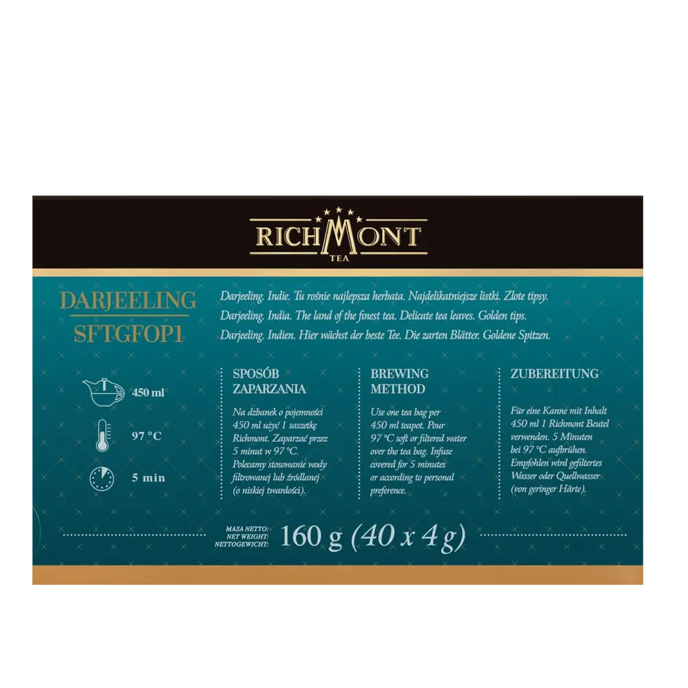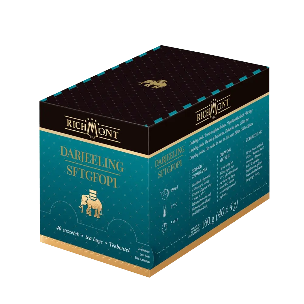 Richmont Darjeeling SFTGFOP1 to wyjątkowa czarna herbata pochodząca z indyjskiego regionu Darjeeling, uznawanego za jedno z najbardziej prestiżowych miejsc uprawy herbaty na świecie. Określana mianem „szampana wśród herbat”, zachwyca lekkością, elegancją oraz wyrafinowanym profilem smakowym.