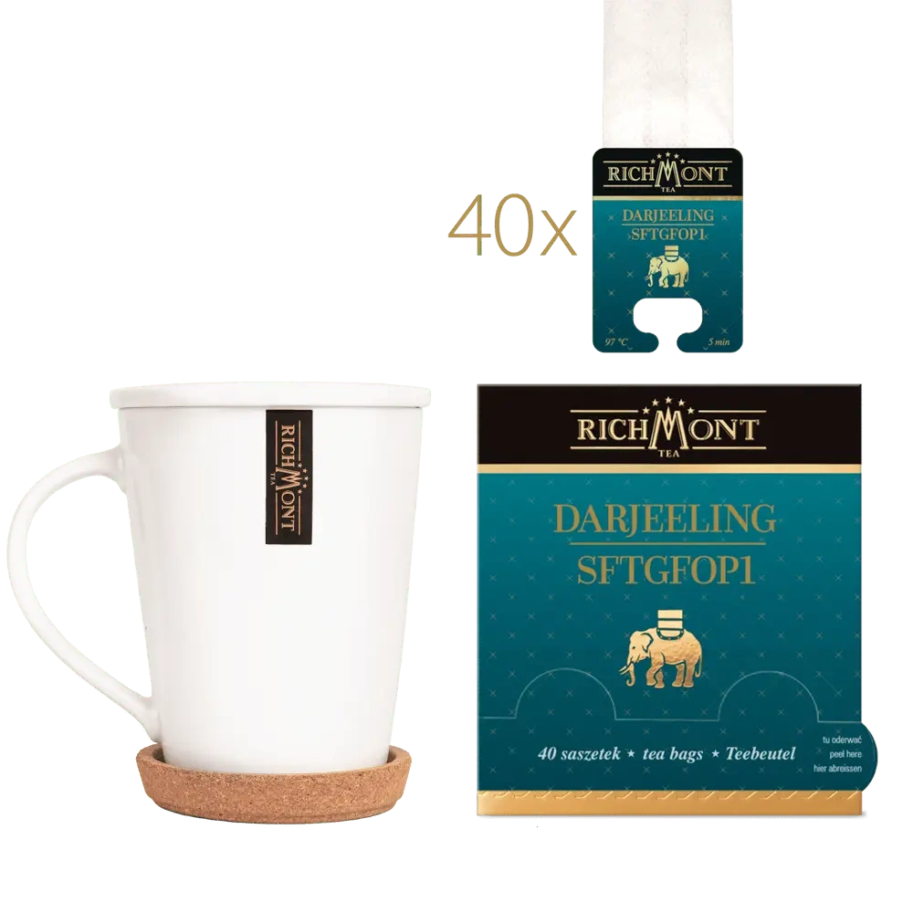 Zestaw dopełnia elegancki porcelanowy komplet Richmont, stworzony z myślą o świadomym rytuale zaparzania herbaty. Pojemny kubek z dopasowanym wieczkiem pozwala utrzymać optymalną temperaturę naparu, a naturalna korkowa podstawka podkreśla estetykę i komfort użytkowania.