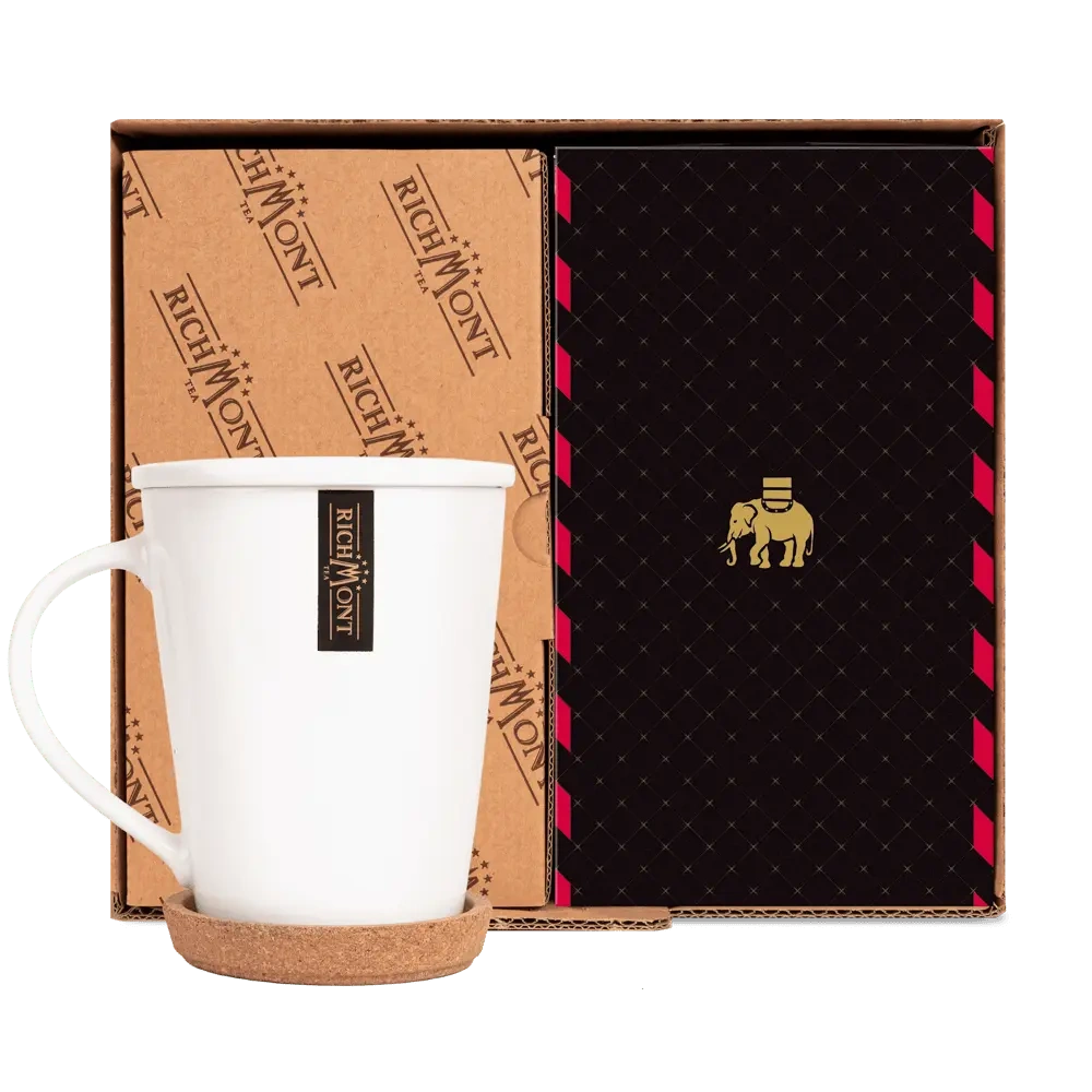Zestaw uzupełnia elegancki porcelanowy komplet Richmont, zaprojektowany z myślą o pełnej celebracji rytuału parzenia herbaty. Pojemny kubek z dopasowanym wieczkiem pozwala utrzymać optymalną temperaturę naparu, a naturalna korkowa podstawka podkreśla komfort i estetykę użytkowania.