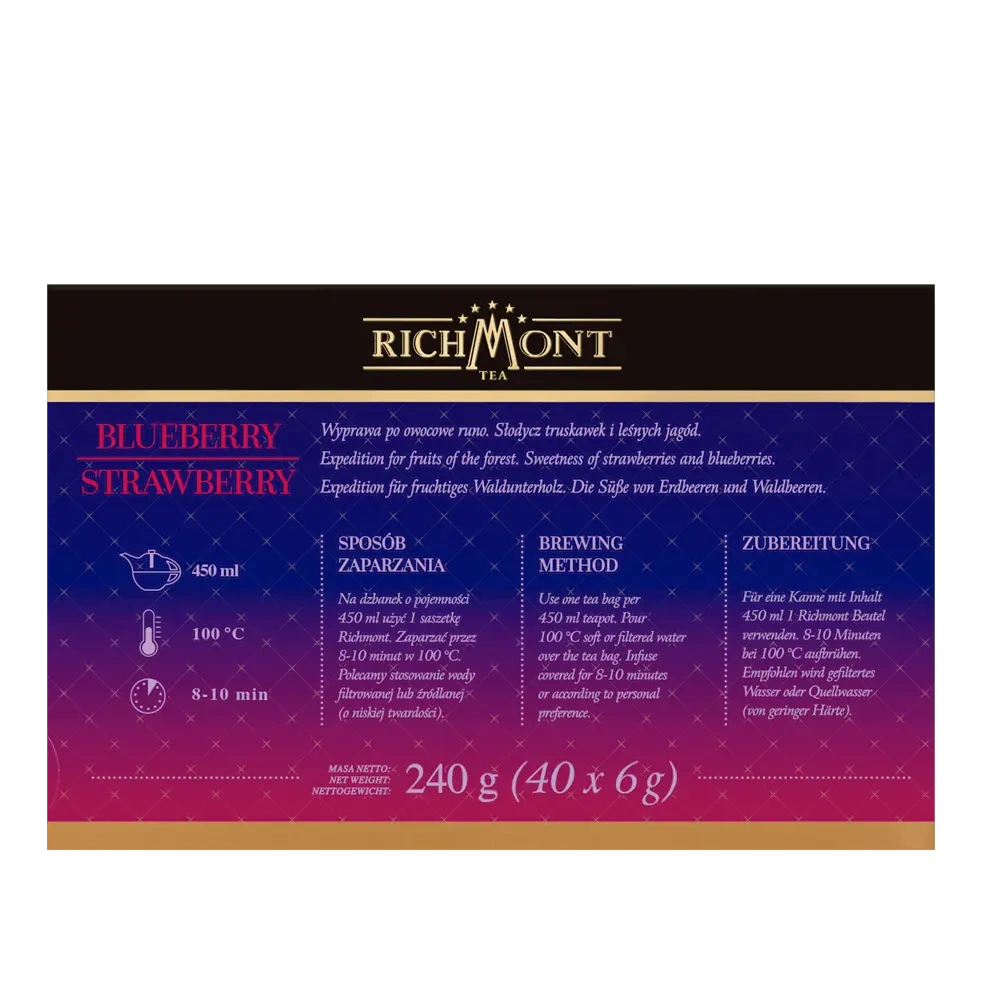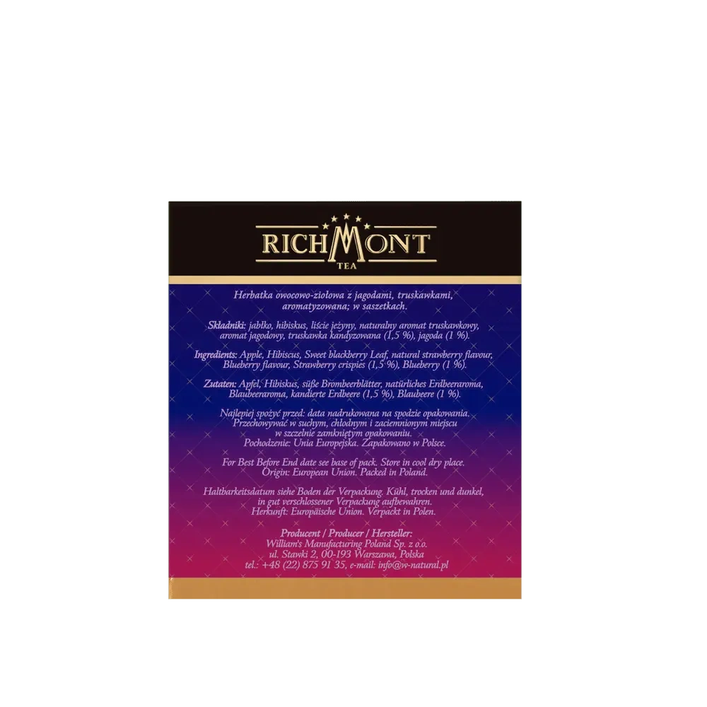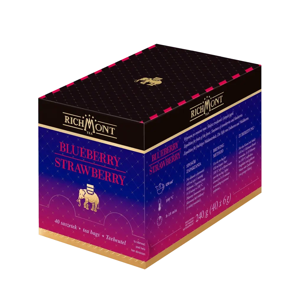 Richmont Blueberry Strawberry to harmonijna kompozycja owocowo-ziołowa, stworzona z myślą o miłośnikach lekkich, aromatycznych naparów. Naturalna słodycz jabłka doskonale współgra z delikatnie kwaskową nutą hibiskusa, a aromaty dojrzałych truskawek i jagód nadają całości świeżości i letniego charakteru.