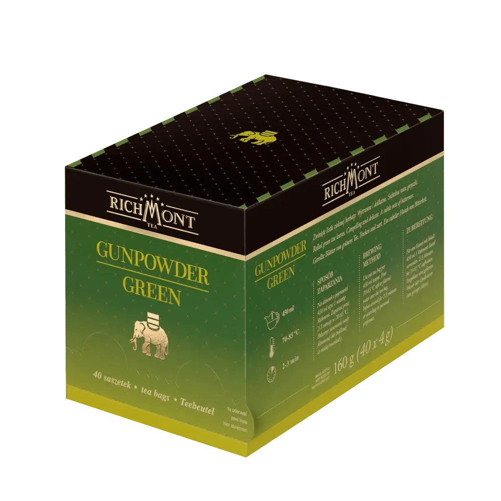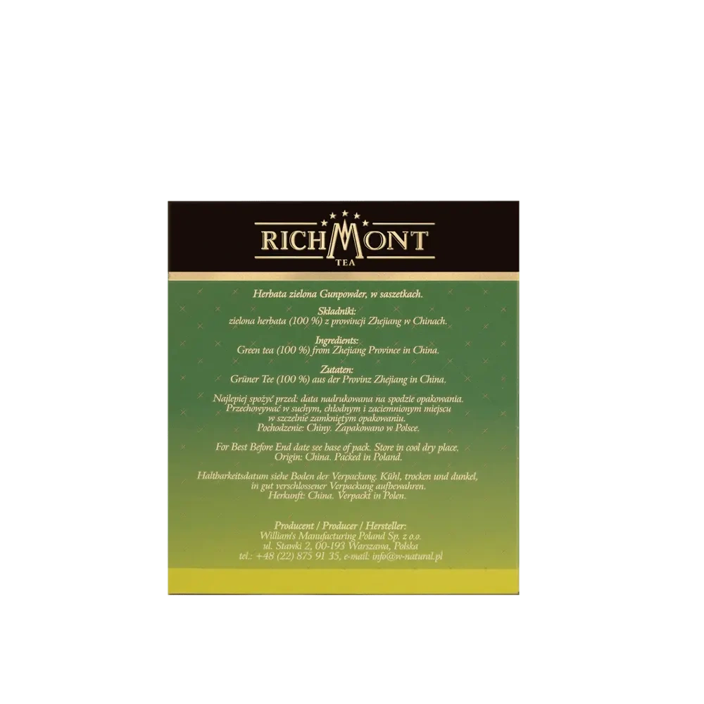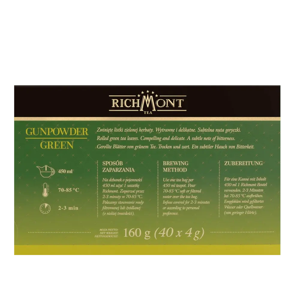 Richmont Gunpowder Green to tradycyjna zielona herbata pochodząca z prowincji Zhejiang w Chinach – regionu słynącego z wielowiekowych tradycji herbacianych. Wyróżnia się charakterystyczną formą ciasno zwiniętych listków, które swoim wyglądem przypominają drobne kuleczki prochu strzelniczego, od czego wywodzi się jej nazwa.