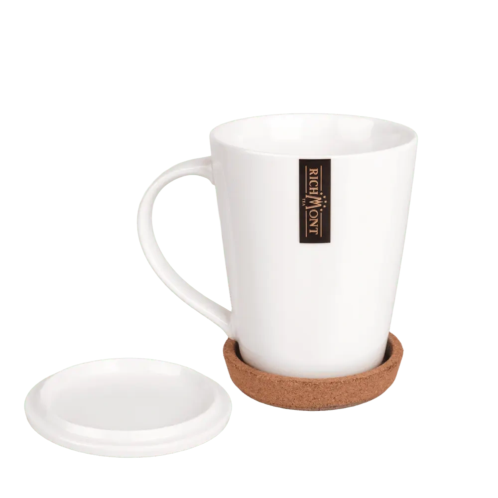 Zestaw uzupełnia elegancki porcelanowy komplet Richmont, zaprojektowany z myślą o pełnej celebracji rytuału parzenia herbaty. Pojemny kubek z dopasowanym wieczkiem pomaga utrzymać odpowiednią temperaturę naparu, a naturalna korkowa podstawka podkreśla estetykę i komfort użytkowania.
