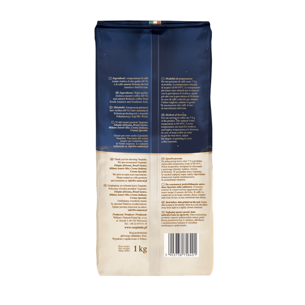 Vaspiatta Roma Classica to klasyczna włoska kompozycja kaw ziarnistych, stworzona z myślą o miłośnikach intensywnego espresso z wyraźną cremą. Starannie dobrane ziarna Arabica z Ameryki Południowej połączone z kawami naturalnymi z Azji Południowo-Wschodniej tworzą harmonijną mieszankę o pełnym body i głębokim aromacie.