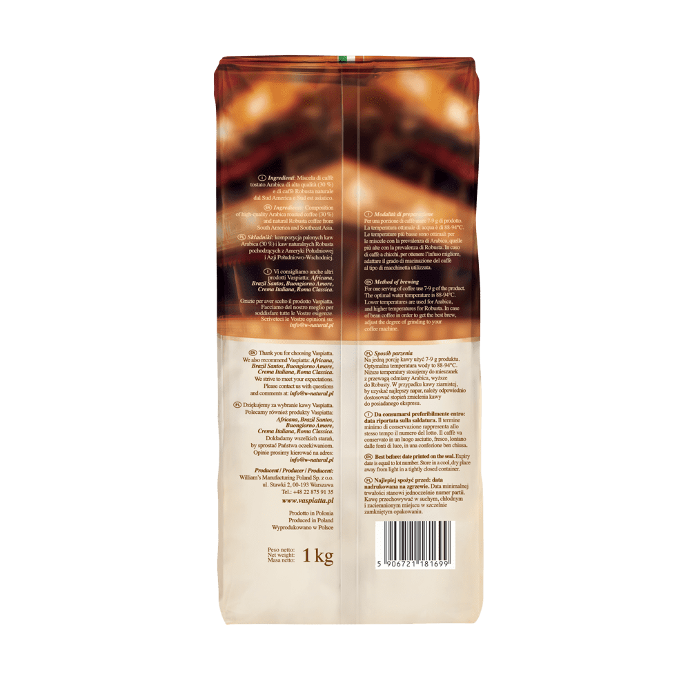 Vaspiatta Crema Speciale 1 kg to kawa stworzona z myślą o miłośnikach gęstej, aksamitnej cremy oraz wyraźnie pobudzającego działania kofeiny. Starannie dobrana kompozycja ziaren Arabica oraz intensywnej Robusty zapewnia pełnię smaku, moc i charakter, które doskonale odnajdują się w codziennym espresso oraz kawach mlecznych.