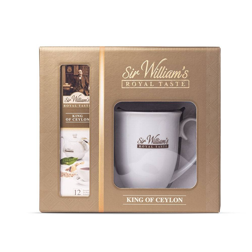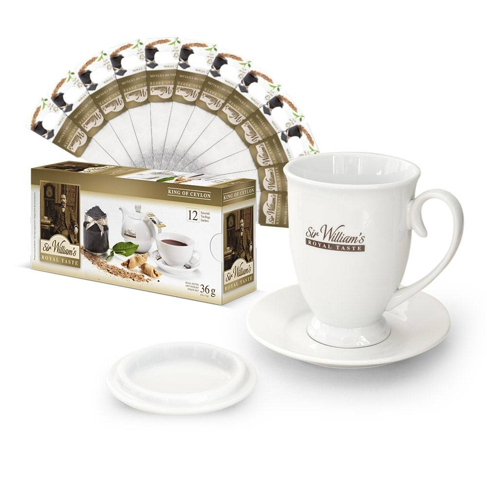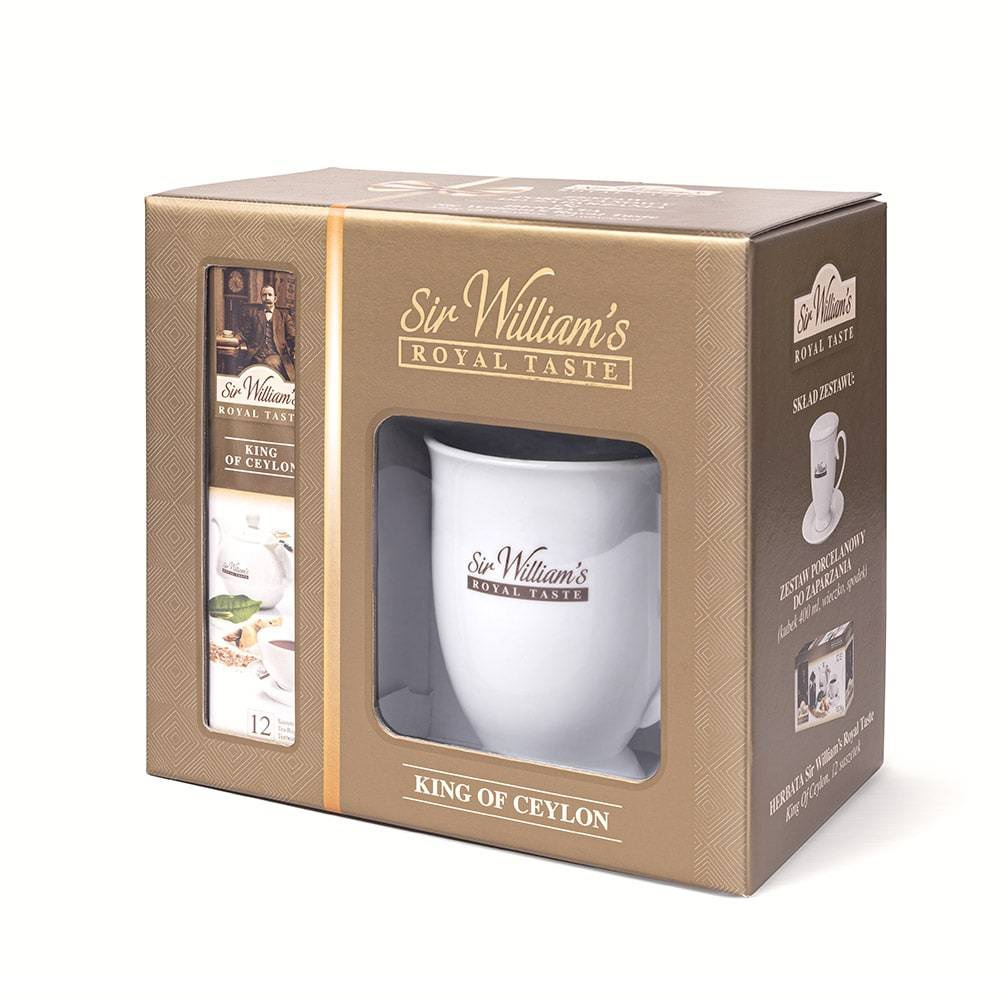 W skład pakietu wchodzi porcelanowy zestaw do zaparzania i serwowania herbat Sir Williams Royal Taste, oraz 12 saszetek herbaty Sir William’s Royal Taste Royal King Of Ceylon, zapakowane w efektowne pudełko prezentowe.